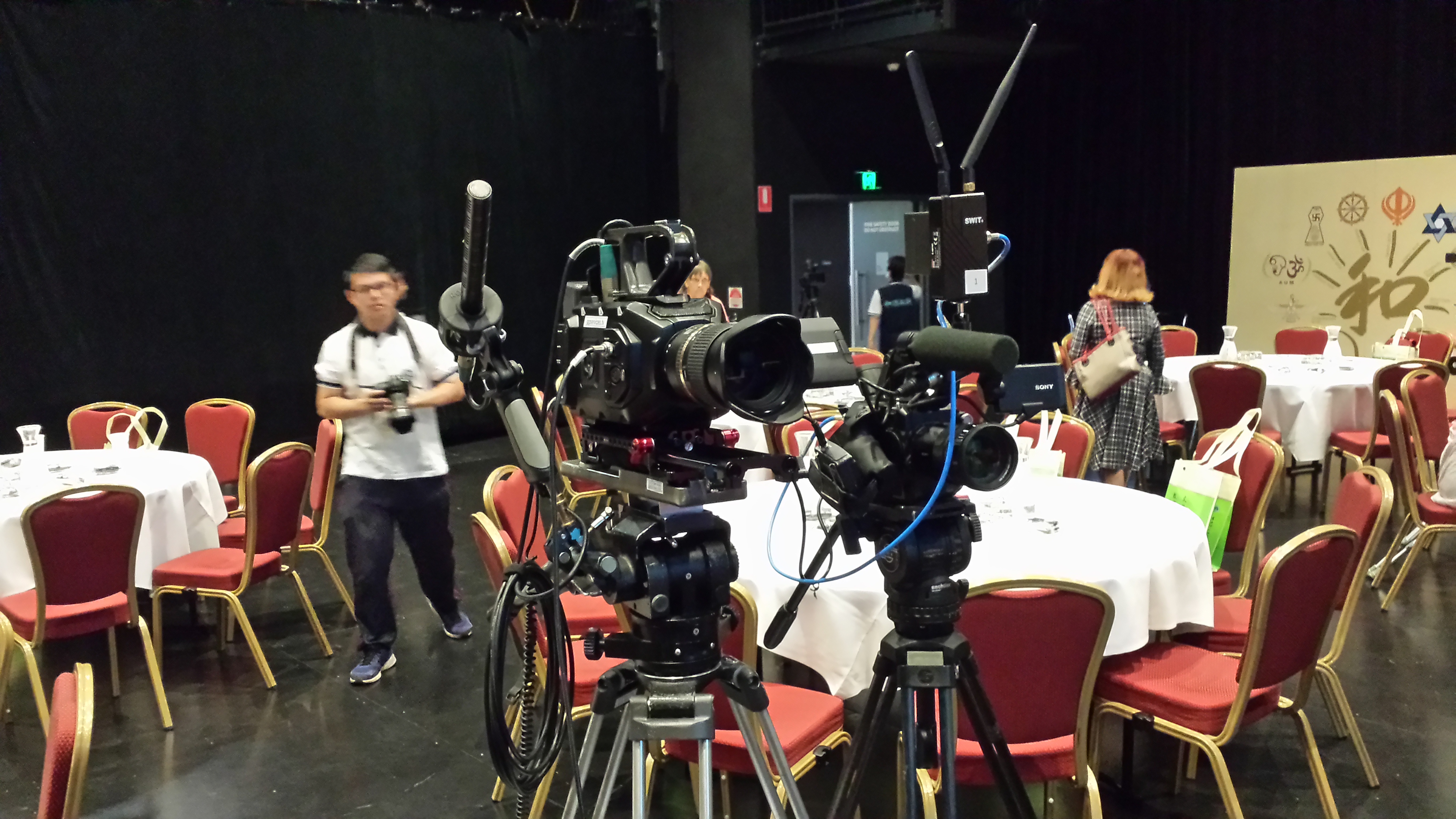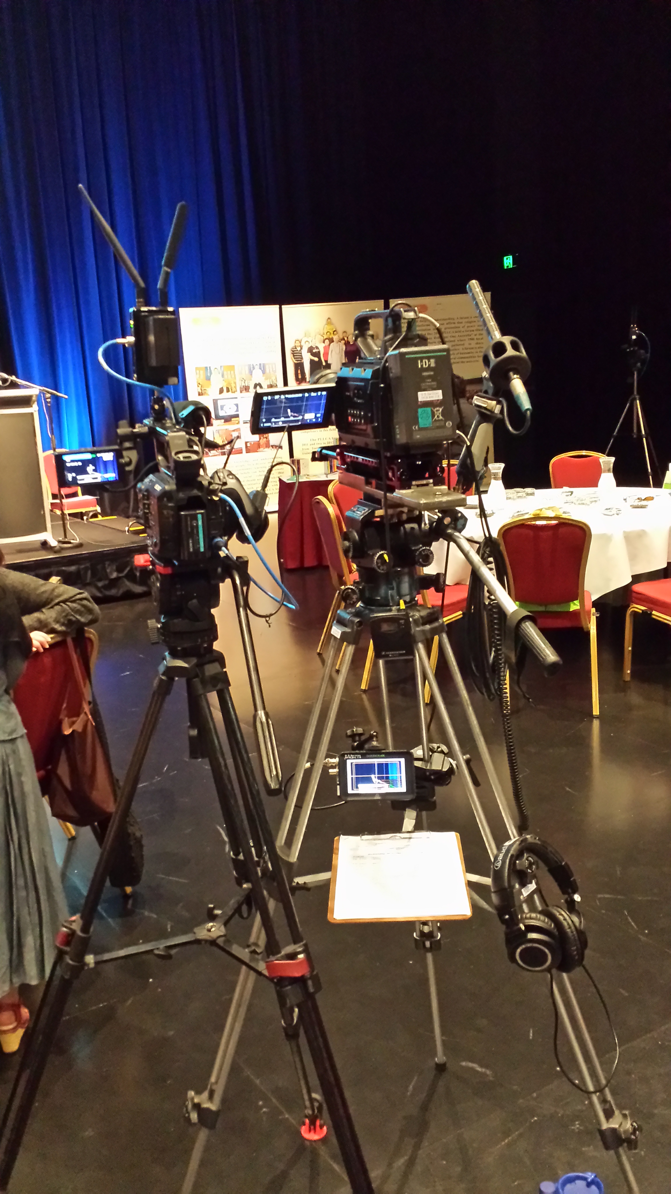 The event was captured by 6 cameras (5 Sonys, 1 Ursa Mini). Each camera was iso-recorded (Sonys onto SD cards, Ursa onto SSD); three cameras were routed to control via SWIT wireless links and one cabled. The switcher output was recorded on a BMD Hyperdeck and live-streamed.